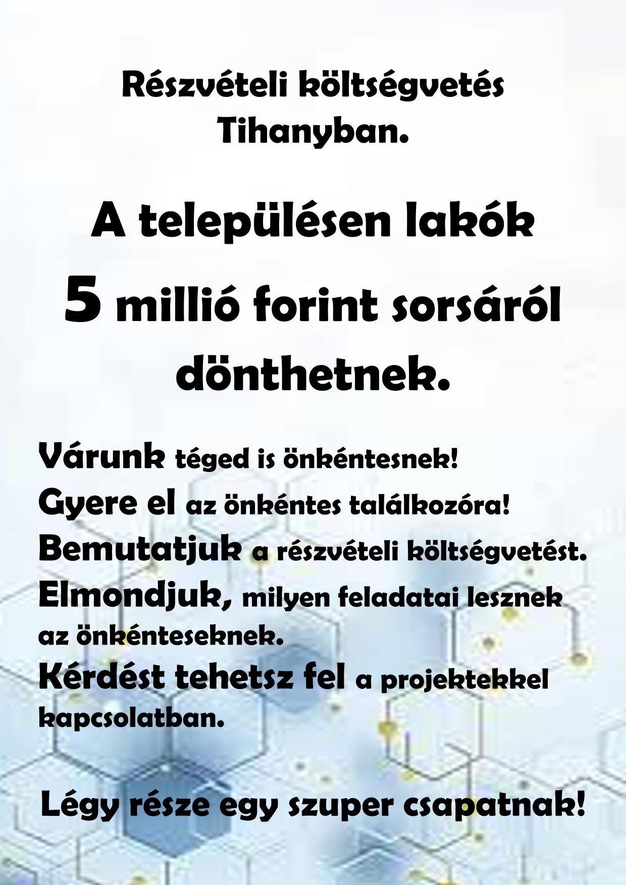 Az Önkormányzat meghirdeti a lakossági Munkacsoport való jelentkezés lehetőségét. Jelentkezni dr. Tóth Judit és Kónya Péter képviselőknél, valamint Tihany Község Önkormányzati Hivatalának titkárságán lehet. A jelentkezőkből kerülnek kiválasztásra a Munkacsoport tagjai. A felhívás a lehető legszélesebb körben kerül meghirdetésre, hogy minél több lakoshoz eljusson, így minél szélesebb társadalmi réteget lefedjen.