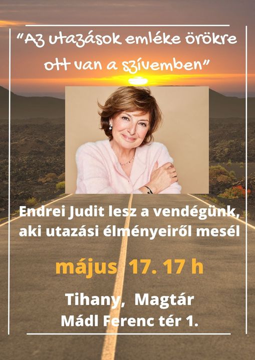 Tihanyi programok Endrei Judit előadása 2024. május 17. "Az utazások emléke örökre ott van a szívemben" Endrei Judit lesz a vendégünk, aki ezúttal utazási élményeiről mesél május 17-én, pénteken 17 órakor a Magtárban (Mádl Ferenc tér 1.). Mindenkit szeretettel várunk!