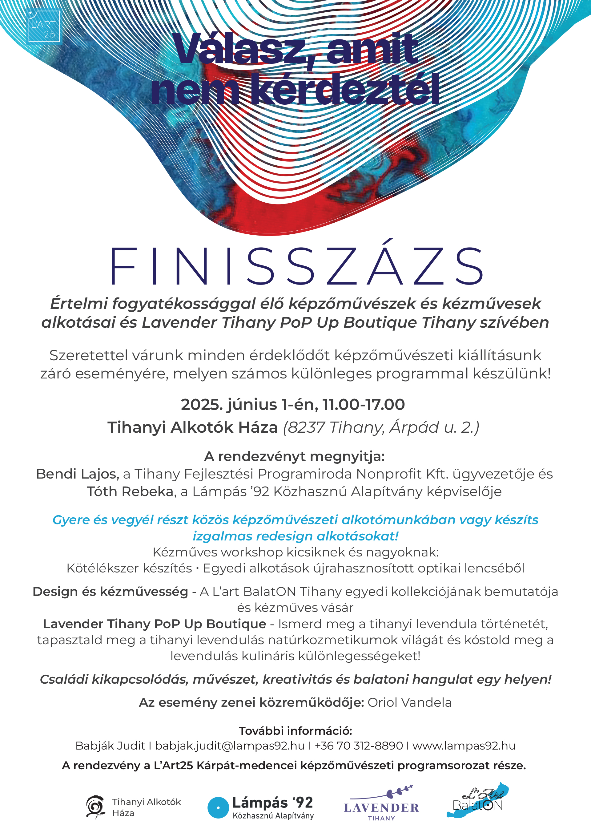 Az Apátsági Rege Cukrászdában nyílt meg az a különleges kiállítás, amelyen a Lámpás ’92 Közhasznú Alapítvány fogyatékossággal élő képzőművészeinek alkotásait tekintheti meg a közönség. A tárlat április vége óta a Tihanyi Alkotók Házának emeleti termében látogatható. A kiállítás egy olyan művészeti program keretén belül valósul meg, amely két évtizede nyújt lehetőséget az ország és a Kárpát-medence számos pontján élő tehetséges értelmi sérült felnőttek művészeti képzésére, illetve, hogy a képzőművészet eszközeivel kifejezhessék gondolataikat, érzéseiket. A tárlat június 1-én egy különleges finisszázzsal zárul, amelynek keretében az érdeklődők személyesen is találkozhatnak a művészekkel, valamint részt vehetnek egy közös képzőművészeti műhelymunkán az Alkotók Háza páratlan panorámájú kertjében.